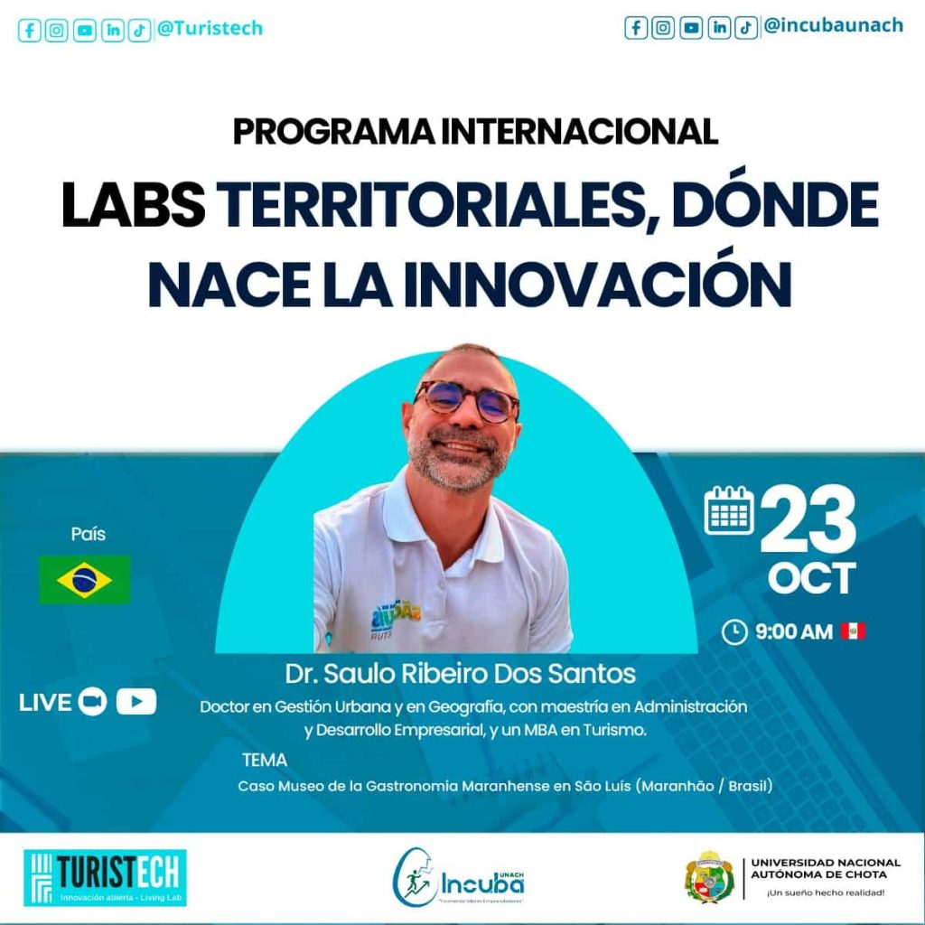 El Programa Internacional LABS TERRITORIALES, DÓNDE NACE LA INNOVACIÓN se prepara para recibir al Dr. Saulo Ribeiro Dos Santos para una inmersión en las estrategias de desarrollo territorial y cultural desde Brasil. El evento en vivo está programado para el 23 de octubre a las 9:00 AM (Peru).